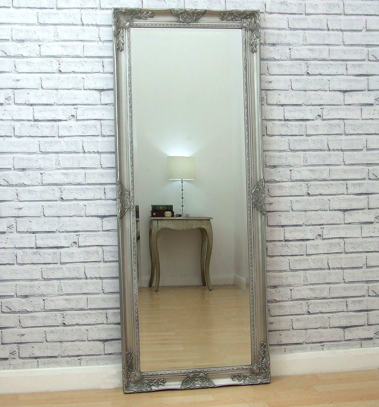 Simple stunning Silver leaner mirror with a charming ornate frame. This mirror will instantly revive any sparse living space adding beauty and elegance. Perfectly suited to a number of different settings from French to traditional and modern vintage this silver mirror offers a versatile design. The timeless antique silver finish exudes sophistication and glamour offering an opulent feel to your living space.