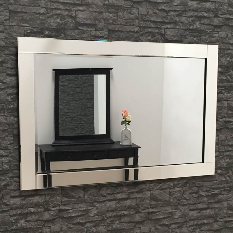 Simplistic, modern design is displayed at its very best in this glass framed mirror. It is of the size where it will fit into any room without dominating but still be noticeable. The expanse of glass can give the illusion of added space in a small room and it blends in with any style décor.