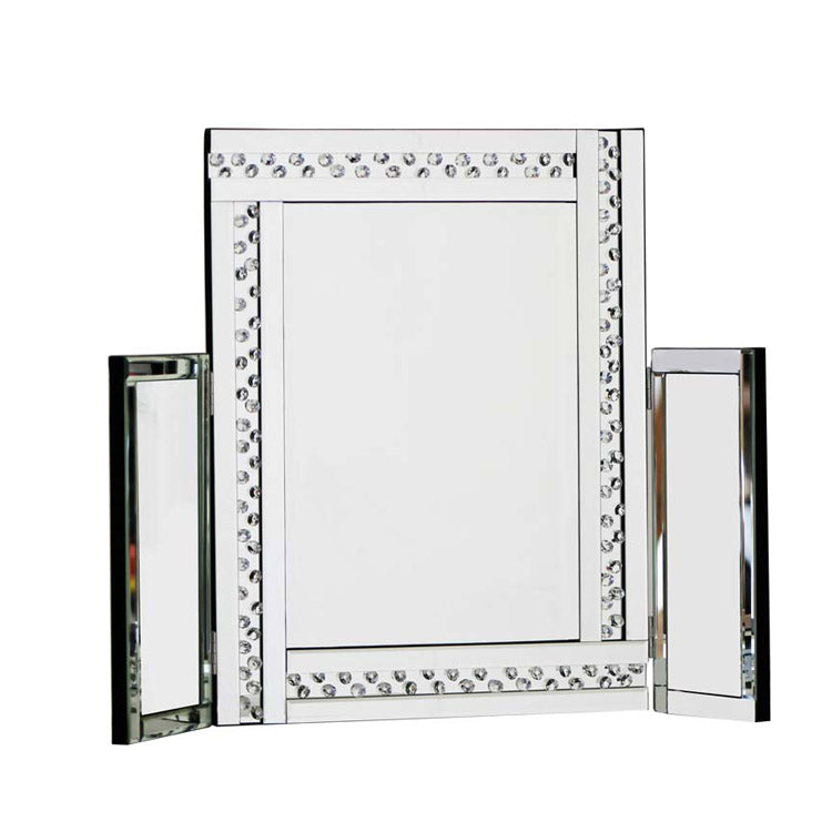 Its sleek, clean lines lend itself beautifully to any modern space. The 4mm Silver mirror with 5mm bevelled edge is mounted on an MDF frame. The mirror features a large centre mirrored area along with 2 smaller mirrored pieces at each design offering a fantastic reflective area from various angles. Great at assisting you when getting dressed this mirror is a must have for any Hollywood glamour themed bedroom.
