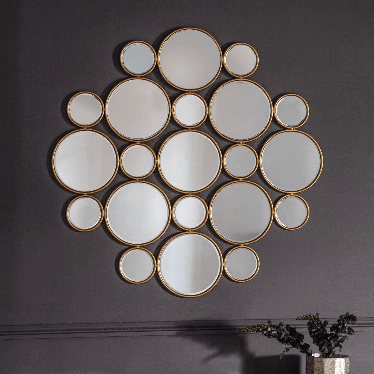This stunning statement mirror offers a stylish elegant design. This unique mirror will grace any wall in your home beautifully. The mirror offers a versatile design and will blend into any current home décor either contemporary or traditional. The mirror is made up of individual round mirrors combined together to create a dramatic look set in a structural metal outer frame.