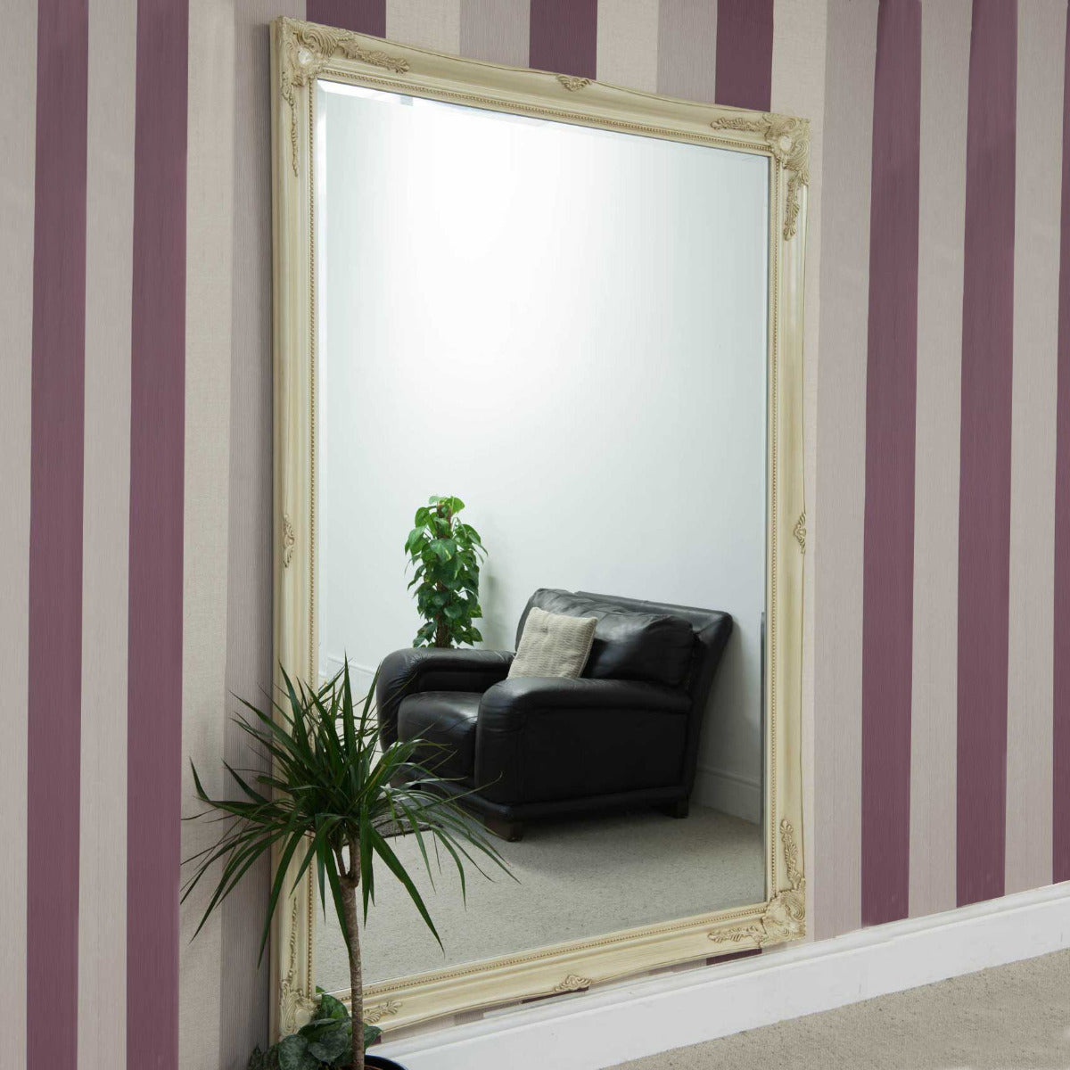 Here we have an extra large classic ivory hand finished French-style frame. The design boasts ornate detailing to all four corners and sides. The mirror glass itself comes bevelled. This mirror has a glass size of 6ft x 4ft or 183cm x 122cm and an overall size of 6ft 7 x 4ft 7 or 200cm x 140cm.