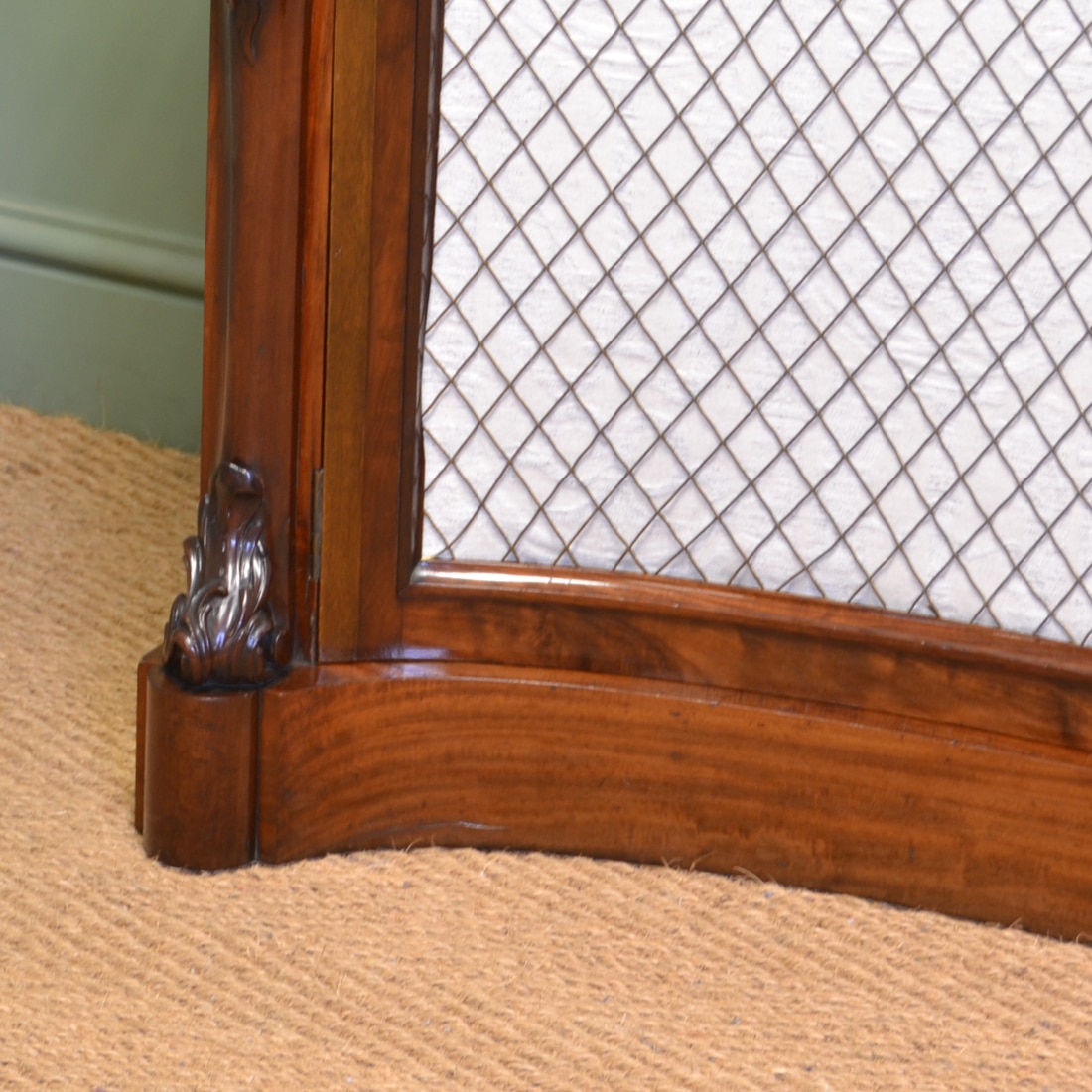 This truly magnificent antique chiffonier / cupboard is the amazing work of a true Victorian craftsman circa, 1860, with the most unusual concave front which is breath-taking. It has a moulded marble top above two cupboard doors with moulded edges, upholstered panels with brass grill work and the most striking vine leaf carved clash mould, the interior comprises of one curved adjustable shelf. The sides have the most spectacular carved corbels and this stunning antique cabinet sits on a concave plinth. The mahogany has aged to a rich shade with a striking grain, good patina, is in very good condition and has been beautifully cleaned using a traditional form of furniture wax finishing.