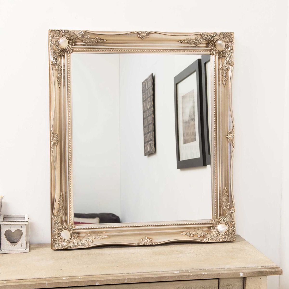 A classic silver hand finished French-style mirror. The design boasts ornate detailing in all four corners and sides. This mirror has a glass size of 2ft x 1ft 8 or 61cm x 51cm and an overall size of 2ft 6 x 2ft 2 or 76cm x 66cm. We stock this frame in 5 different colours white silver gold ivory and black. 11 different sizes from 76cm x56cm to 167cm x 106cm.